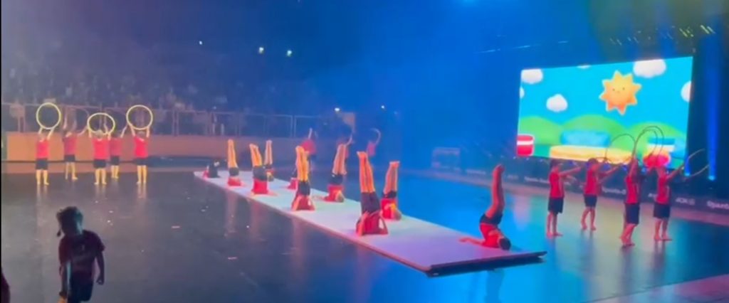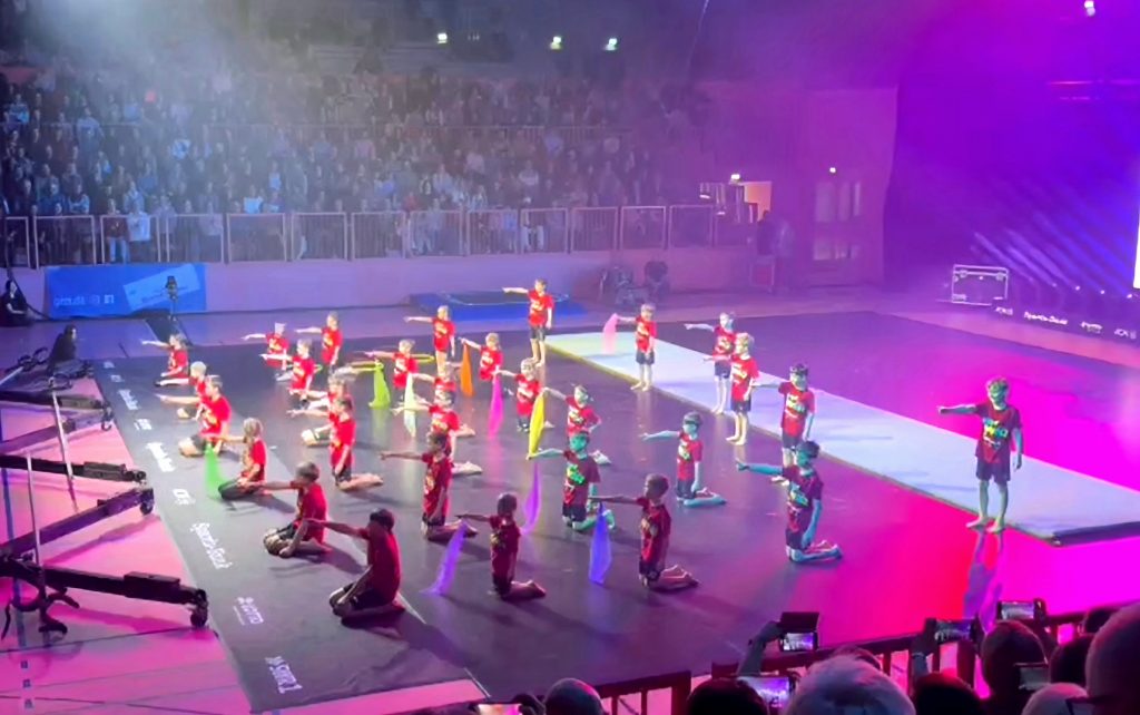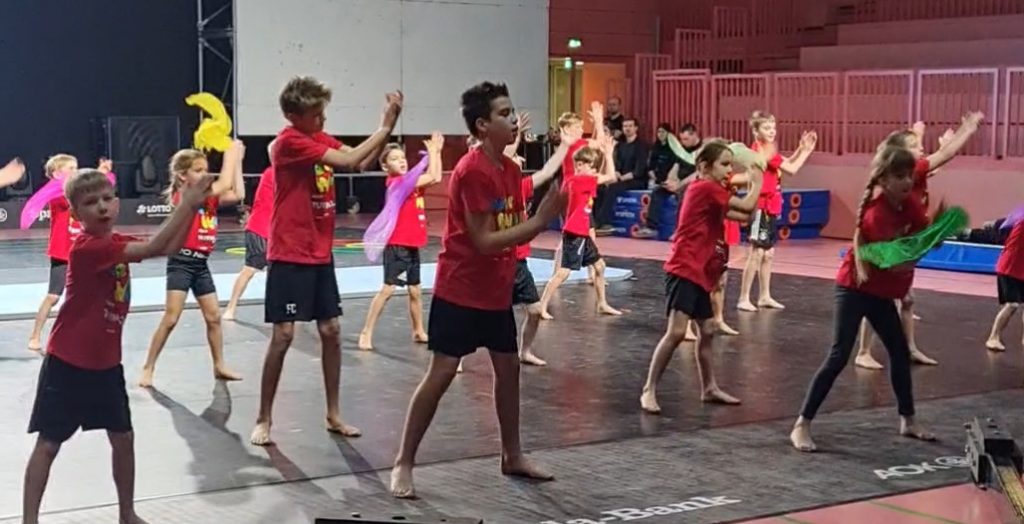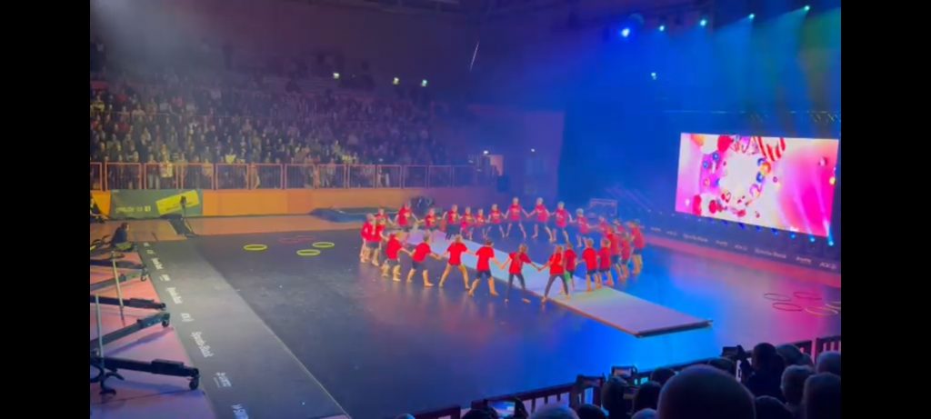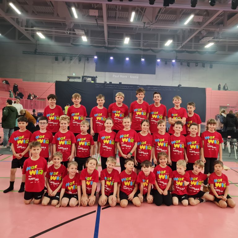 Mit 30 Kindern bildeten junge Turnerinnen und Turner bei der Turngala des Schwäbischen Turnerbunds in der Tübinger Paul Horn Arena die lokale Kindergruppe. Seit Ende Oktober liefen die Vorbereitungen auf die Vorführung auf Hochtouren und die Übungsleiterinnen hatten immer wieder den Bewegungsdrang der Kinder etwas zu bremsen und den Fokus auf eine stetige Verbesserung des Auftritts zu lenken. Die Generalprobe in der Paul Horn Arena am Samstagnachmittag gelang dann aber recht gut und die Kinder erhielten schon mal Applaus von den wartenden Profikünstlern. Nach der Begrüßung und einer ersten Vorführung der Sportgymnastinnen der TSG Tübingen kam dann der Auftritt unserer Nachwuchsturnerinnen und Turnern. Dieser gelang trotz der Aufregung sehr gut und die Kinder konnten dann im Anschluss daran die folgenden Vorführungen aus dem Innenraum verfolgen. Es gab ein sehr interessantes Programm mit Sportakrobatik, Trampolin, Jonglage und vieles mehr von internationalen Künstlerinnen und Künstlern, welche das Publikum begeisterten.